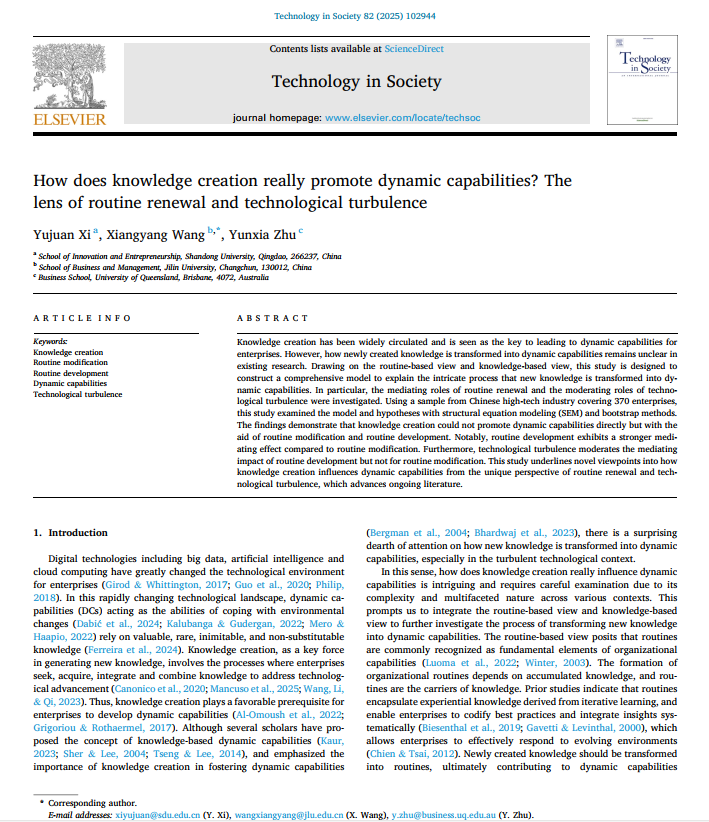 郗玉娟助理研究员与合作者以“How does knowledge creation really promote dynamic capabilities? The lens of routine renewal and technological turbulence”为题的研究论文,在管理学领域期刊《Technology in Society》上发表。该期刊是JCR一区中科院一区Top期刊,最新影响因子为10.1。郗玉娟助理研究员为该论文的第一作者,成人小说